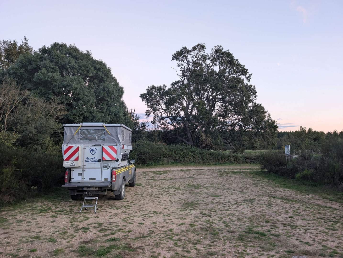 Vandaag werden we wakker onder vijandelijk vuur… maar dan plantaardig. De sluipschutter eikels brachten de nacht door met duikvluchten op het dak van de camper, alsof ze trainden voor een stille oorlog. Het deed geen pijn, maar elke klap klonk als een katapultschot. Toch, tussen de aanvallen door, lukte het ons om behoorlijk te slapen. Geen rave-auto's, geen schreeuwende mensen, geen plattelandsreguetón: alleen eiken met een slechte richtvaardigheid.