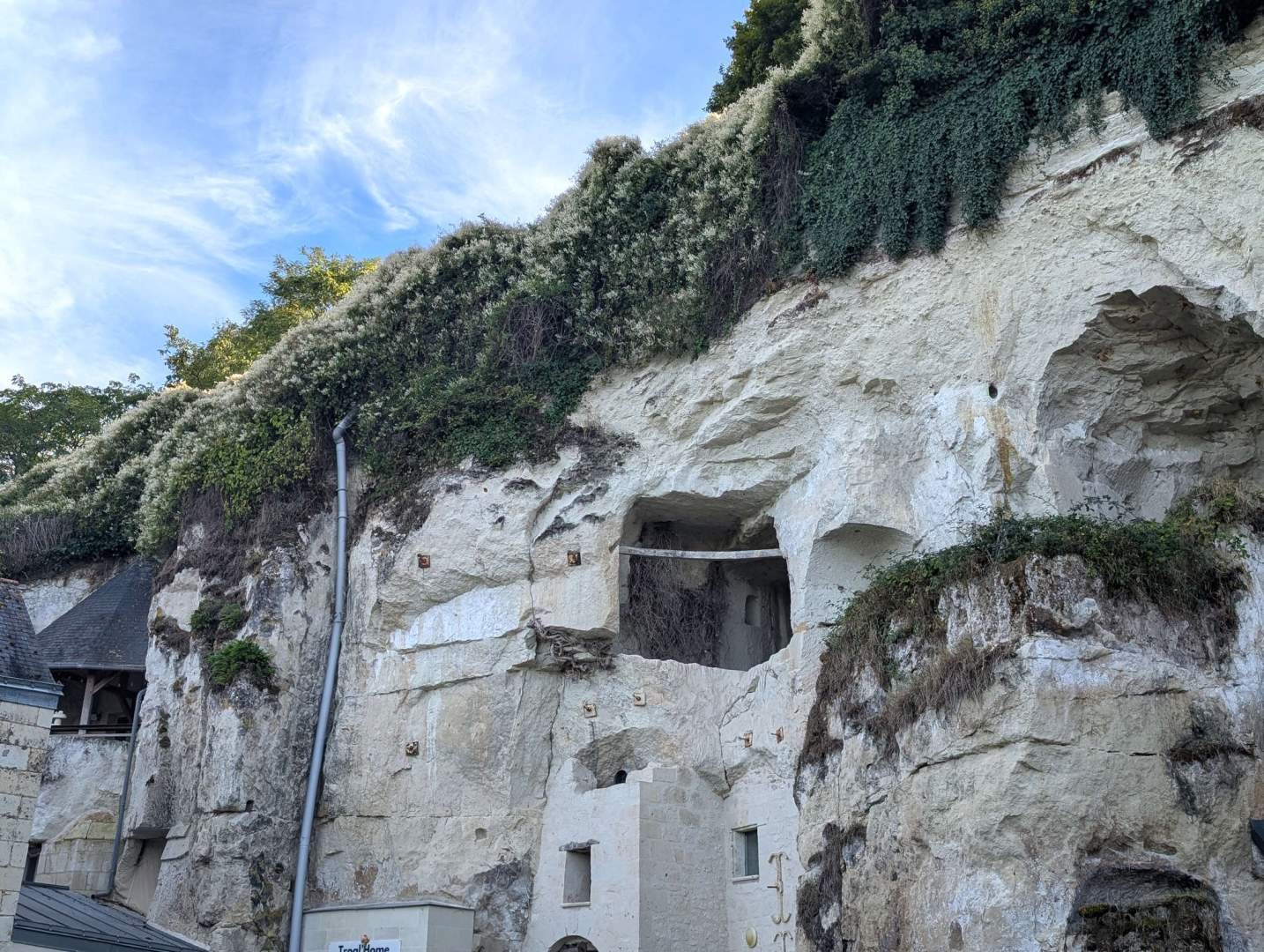 Daarna korte weg naar Turquant. We parkeerden onder de bomen en wandelden tussen troglodytische huizen die eruitzagen alsof ze uit een Franse versie van Cappadocië kwamen. Grotten omgebouwd tot werkplaatsen, woningen onder de rots, verborgen galerijen... erg elegant troglodyte. We hielden van de rustige en mysterieuze sfeer van de plek.