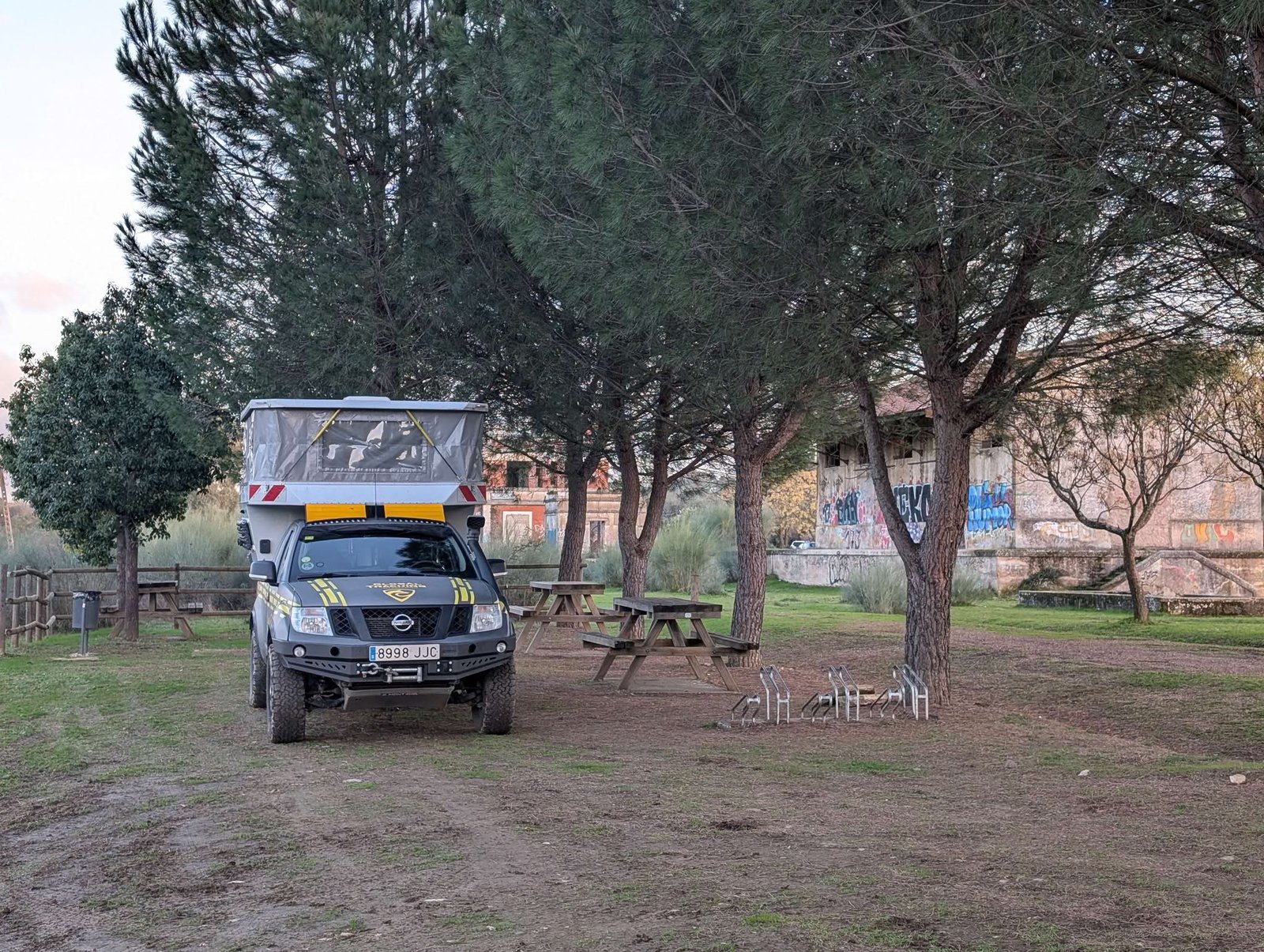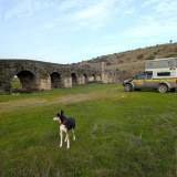 Uiteindelijk pakten we de auto na één uur. Rustige snelweg richting Trujillo. We kwamen aan en parkeerden op het camperterrein of de camperparkeerplaats. Eerst deden we de reisroutine. Water innemen, grijs water legen en goed parkeren. Er stond net naast ons een andere camper en een man was een elektrische motor uit de garage aan het halen, alsof het een nieuw speeltje was.