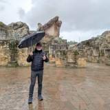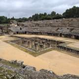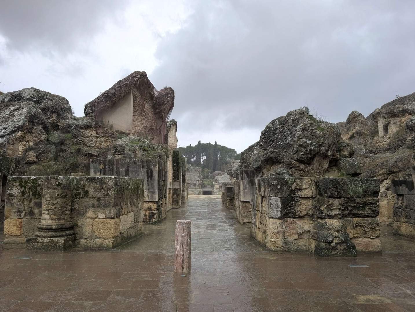 Na een uur kwamen ze terug. Een gezicht van culturele voldoening en een beetje kou. We startten weer en parkeerden in de buurt van de ingang van Itálica. Hier herhaalden we het spel. Ik in de camper, zij om Romeinse ruïnes te bekijken. Er begon een fijne motregen te vallen, eentje waarvan je niet weet of je nat wordt of alleen maar last hebt. Itálica is geweldig, zelfs van een afstand gezien. Het was de eerste Romeinse stad die buiten Italië werd gesticht. Hier werden Trajanus en Hadrianus geboren, wat niet niks is. Het heeft een enorm amfitheater, een van de grootste van het Rijk, met plaats voor vijfentwintigduizend mensen. Geplaveide straten, huizen met mozaïeken, overblijfselen van thermen, alles heel Romeins en heel netjes. Papa Edu kent het uit zijn hoofd omdat hij er een paar jaar geleden als gids werkte toen hij fietstochten door Sevilla maakte. Dus hij wees dingen aan, vertelde verhaaltjes en dacht vast "dit weet ik al, maar het is nog steeds mooi".