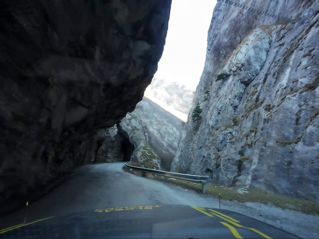 Con el buen tiempo teníamos claro que queríamos caminar. Subimos hacia una carretera helada que parecía prometedora para el senderismo, pero ¡vaya chasco! No había dónde aparcar porque la nieve formaba muros altísimos. Así que cambiamos de planes y bajamos hacia Pejë (Peche) para seguir hacia la frontera con Montenegro y probar suerte con otra ruta ese país.