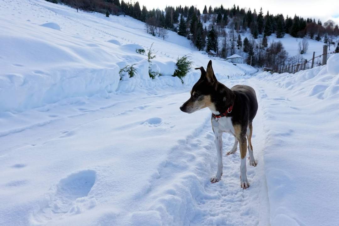 Poco después de cruzar la frontera, encontramos un sitio sin nieve para aparcar y varios senderos largos. Optamos por caminar por una carretera nevada y aplastada, perfecta para mis patas. ¡Qué pasada! Corría, saltaba y hundía el hocico en la nieve como si buscara un tesoro helado. Caminamos unos dos kilómetros de ida y otros dos de vuelta, y cada paso fue pura felicidad. Este momento fue, sin duda, lo mejor del del día.