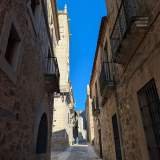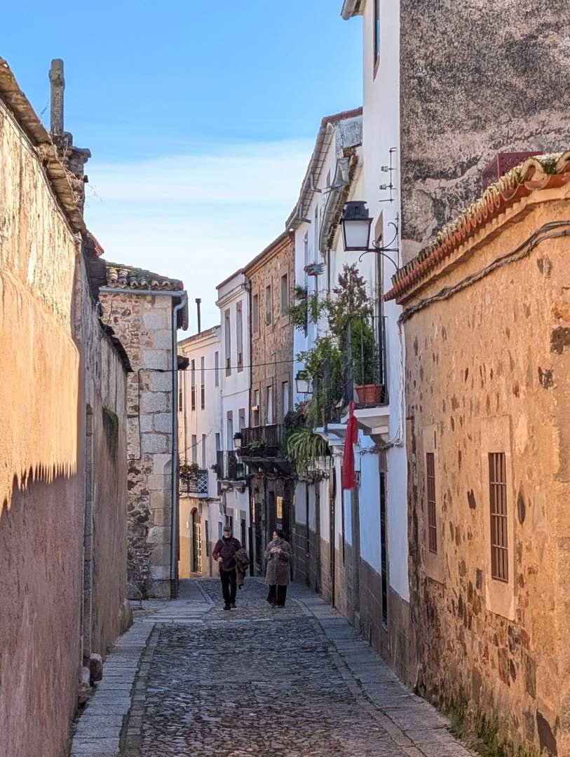 Aparcamos gratis en un barrio residencial de Cáceres, muy cerca del centro, y nos lanzamos a explorar a pie y a pata. Cáceres es de esas ciudades que no hacen ruido pero te miran muy fijamente. El casco histórico es Patrimonio de la Humanidad y se nota, porque está increíblemente bien conservado. Calles de piedra, torres, palacios y sensación constante de que en cualquier esquina va a aparecer un caballero medieval pidiendo wifi.