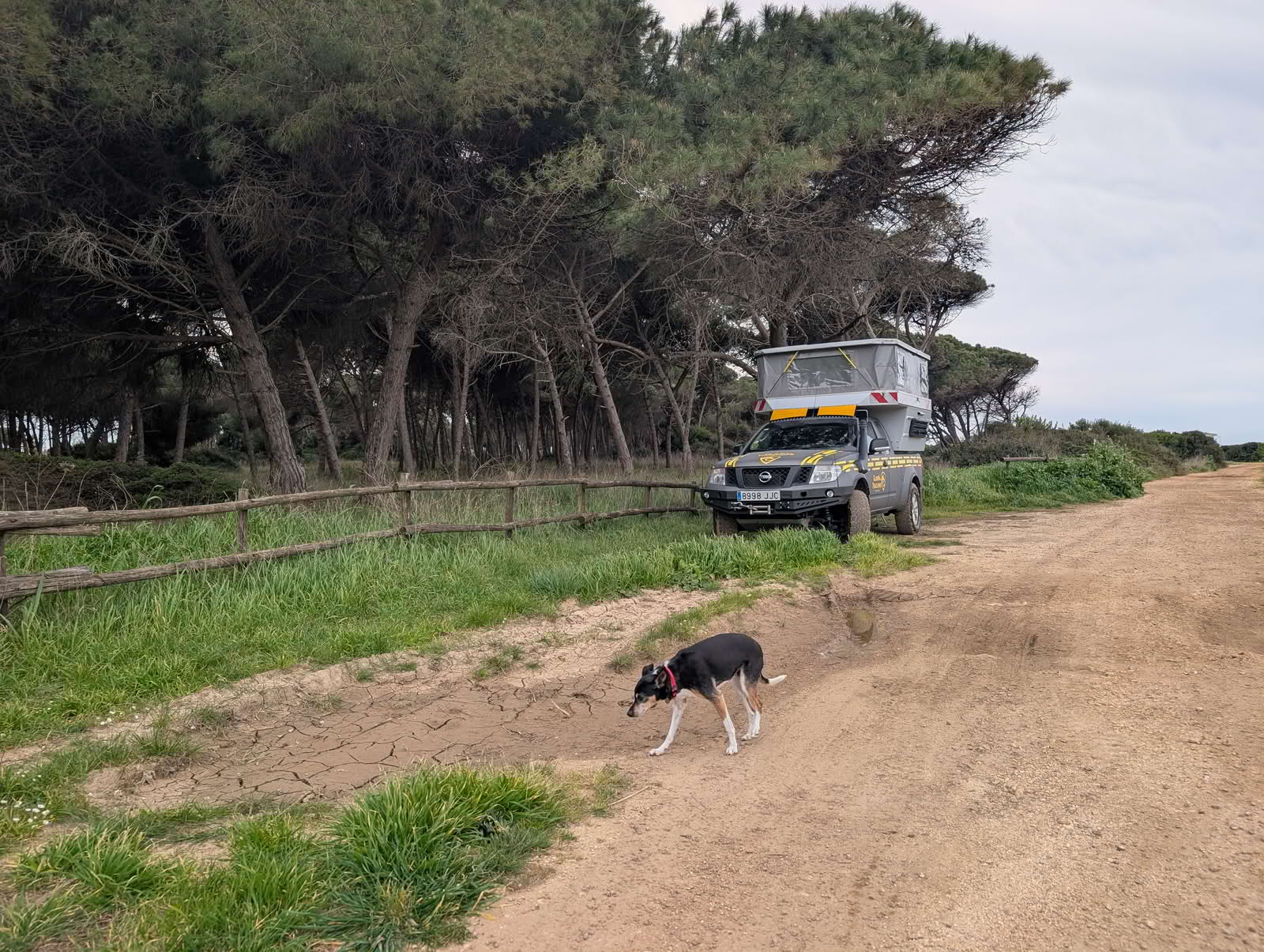 Así que tocó plan B. Como el viento venía del noroeste, bajamos hacia la costa, que estaba mucho más protegida. Y oye, acierto total. Encontramos un sitio bastante guay, entre un pinar y la playa, justo al norte de Civitavecchia. Tranquilo, resguardado y con olor a mar, que siempre suma.