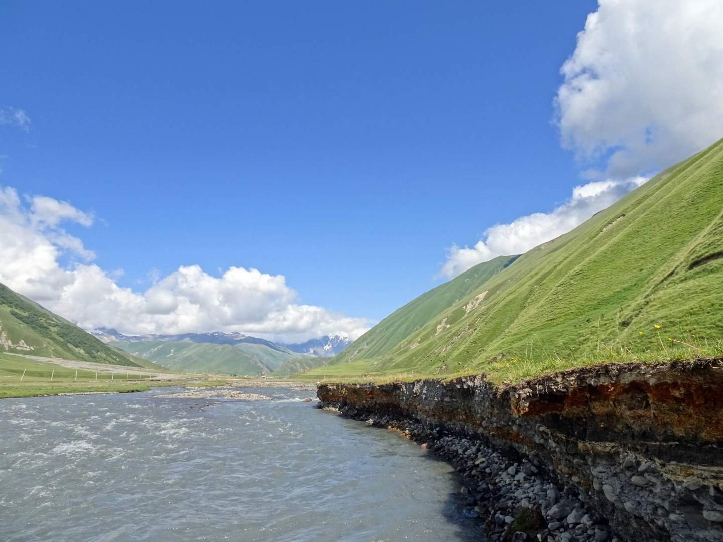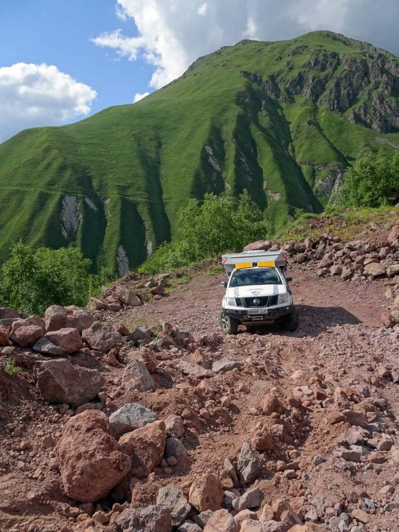 Comimos y descansamos un rato en la cámper y luego comenzó la peor parte del día: la vuelta en dirección Tiflis. Primero tuvimos que salir hacia la carretera principal. Mi papi intentó coger otra ruta, por encima de la montaña, pero el camino era tan mala que decidió darse la vuelta y cogimos la misma ruta que esta mañana, por el cañón de Truso. Luego lo peor de todo fue el trayecto por la carretera principal, la llamada Autovía Militar. Igual que hace unos días, había muchísimo tráfico, muchas obras y muchas retenciones. Sólo hicimos unos 75 kilómetros, pero nos costó tres horas, ufff. Y todo esto sin parar, porque las atracciones y vistas ya habíamos visto cuando subimos hace unos días.