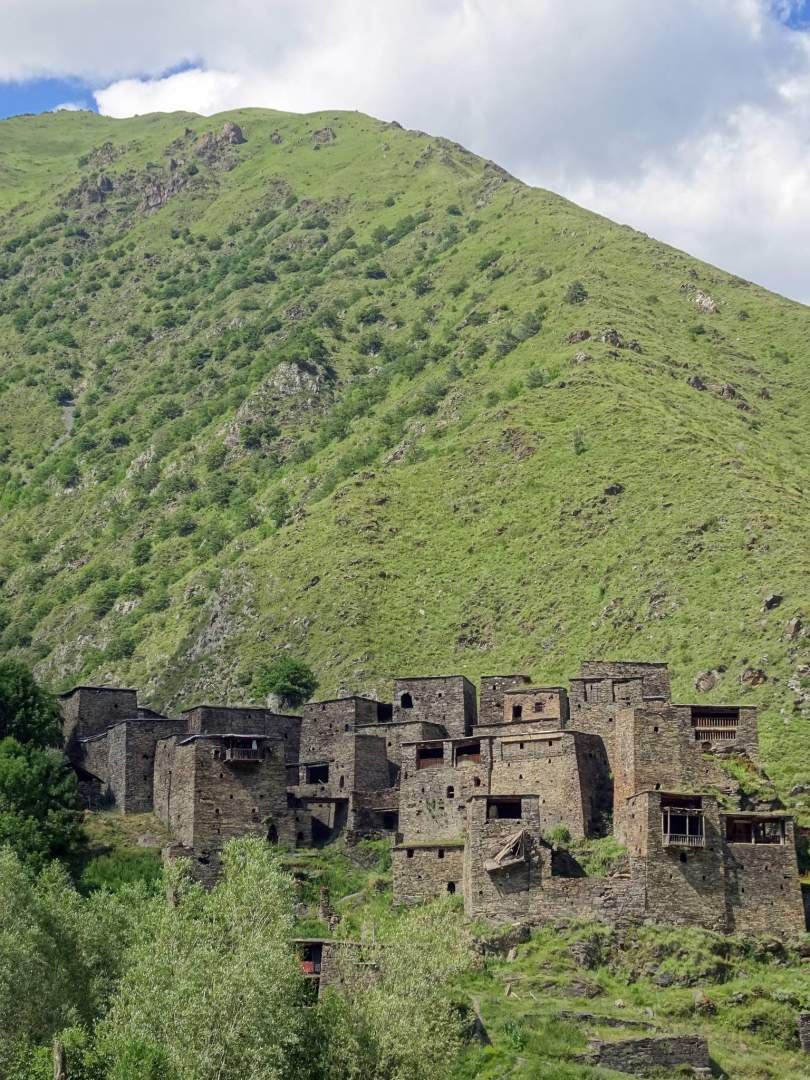Al final de la carretera está Shatili, que resultó ser un pueblo con esas típicas casas torres tan características de Georgia, como si estuviéramos en un cuento de perros aventureros. Cerca del pueblo encontramos un lugar maravilloso para pasar la noche junto a un río que hace tanto ruido como un perro persiguiendo una pelota. Ya había otra cámper alemana, pero esta vez decidimos no entablar conversación.